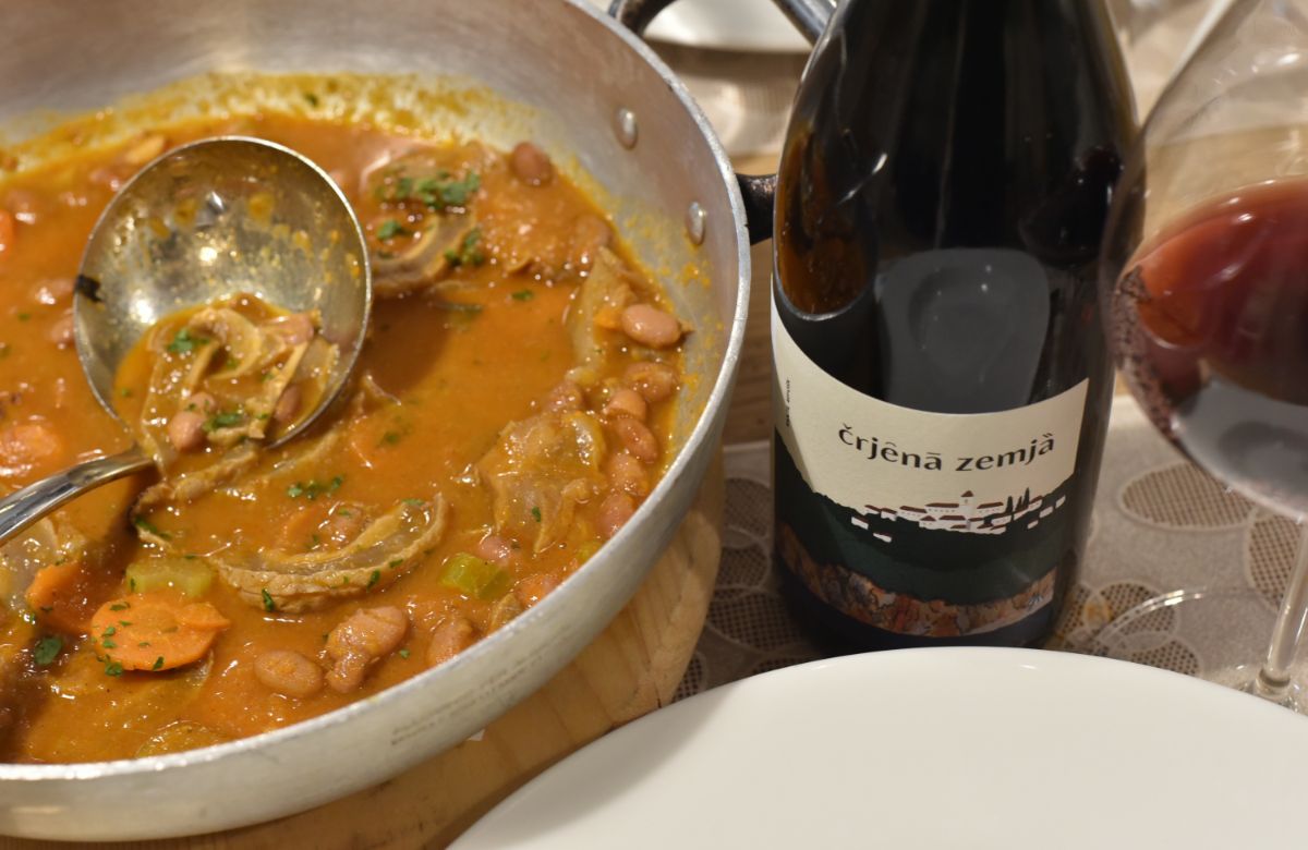Na stol su stigle nove žlice a s njima i Tripice od grdobine s fažolom, jelo s kojim se dosad nismo susretali u zagrebačkim ribljim restoranima, a nije tako često niti na jelovnicima restorana na Jadranu. Ekskluzivitet tog jela iz kategorije ‘obožavam ili ne podnosim’ pratilo je i posebno vino Črjena zemja 2023 iz vinarije Kapîć u Matuljima, nazvane po nadimku jednog od predaka. Predstavio ga je vlasnik Toni Babić, spomenuvši i poteškoće u administrativnoj borbi kako da ova kupaža (50 % terana i 50 % refoška) od grožđa s područja istarskog Novigrada dobije oznaku pripadnosti vinogradarskoj regiji Primorska Hrvatska. Vino je provelo godinu dana u barrique bačvama, osam mjeseci u inoxu, a ostatak u bocama. Bilo bi poželjno da je odležalo još barem šest mjeseci, ali se Babiću činilo zgodno ipak ga predstaviti u ovoj prigodi. Pritom nije pogriješio, jer se fino naglašena kiselina s malo drva na nosu i aromama tamnog bobičastog voća izvrsno stopila s iznutricama od grdobine. Inače, vino je dobilo naziv po toponimu gdje se vinar kao dječak kupao i skakao sa stijena.