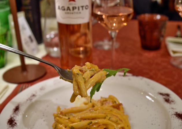 Nastavak u tanjurima i čašama bio je u istarskom štihu. Pljukanci u umaku od pršuta i kadulje posluženi su uz vino Hrvatica Rose 2024 vinarije Agapito iz Marčenegle kod Buzeta. Vinariju vodi mladi Paolo Agapito, nastavljajući obiteljsku tradiciju započetu još u 19. stoljeću. U podrumu spajaju tradicionalno i moderno, a orijentirani su na autohtone, ali i pomalo zaboravljene sorte kao što su duranija, trbljan, likant i muškat crni, među kojima je i hrvatica, koja je bila pred izumiranjem, sačuvana na svega nekoliko trsova. Vinifikacija ovoga svježeg i pitkog rosea odrađena je s četiri sata kriomaceracije (proces u kojem se masulj drži na temperaturi 4-5 C°) što oslobađa dodatne arome, a potom se primjenjuje fermentacija na spontanim kvascima. Vrlo neobična Hrvatica izvrsno se ispreplela s okusom sočnog umaka od pršuta i kadulje čineći nevjerojatno dobar spoj tako da je većina prisutnih novinara tu kombinaciju vina i hrane proglasila najuspjelijom. Agapito je vinarija koja će zasigurno još puno zanimljivog dati istarskom i hrvatskom vinarstvu, a na putu je prema dobivanju ekološkog certifikata.