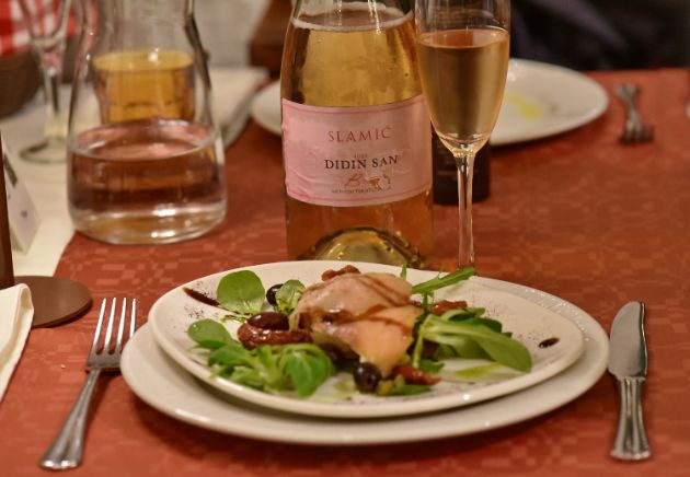 Uz prvi slijed jela, ukusnu i maštovitu Brusketu s dimljenim lososom, upoznali smo se s prvim vinom večeri – pjenušcem Didin san Rosé brut iz obiteljske boutique vinarije Slamić. Vinariju je pokrenuo Dane Slamić koji je od svoga oca naslijedio vinograde u Ljubostinjama, u zaleđu Šibenika, posao je nastavio njegov sin Davor, a pridružio im se i unuk Luka Slamić. Osim u Ljubostinjama, vinarija ima više manjih vinograda u Donjem Polju kod Vrpolja. U ponudi je šest etiketa, među kojima i ovaj odličan pjenušac Didin san Rosé brut od sorte grenache noir koja se ekološki uzgaja u Nadinu kod Zadra. Pjenušac se proizvodi tradicionalnom metodom vrenja u boci, čemu se pridaje posebna pažnja kako bi se korištenje kemijskih pomagala, primjerice sumpora, svelo na minumum. Obitelj Slamić teži proizvodnji ekoloških vina koja, osim visoke kvalitete, odražavaju i autentičnost terroira.