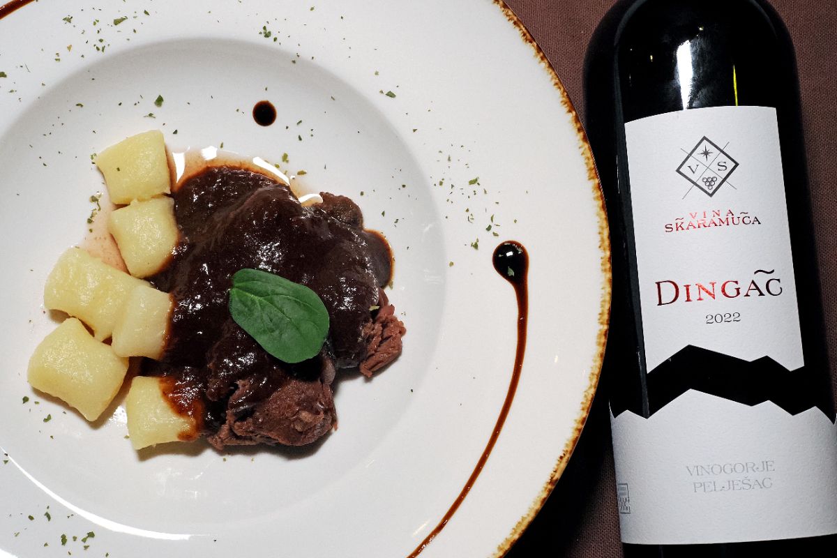Vrhunski specijalitet kao što su Juneći obrazi u umaku od suhih šljiva s njokima, zaslužuje i vrhunsko vino kakav je Dingač 2022 vinarije Skaramuča iz mjesta Pijavičino na Pelješcu. Ovaj spoj jela i vina eno-gastro novinari proglasili su najboljim na 30. Vinu uz žlicu, projekta koji s velikim entuzijazmom organiziraju Renata Cisar i Mustafa Topčagić. Dingač je prva vinska apelacija u Hrvatskoj i bivšoj Jugoslaviji koja je dobila zakonsku zaštitu zemljopisnog podrijetla još 1961. godine. Status mu je dodatno potvrđen pri Međunarodnom uredu za zaštitu intelektualnog vlasništva u Ženevi (WIPO) koji mu je 1964. godine izdao certifikat o zaštiti. Ovo vino od sorte plavac mali odlikuje se rubin crvenom bojom, harmoničnom punoćom okusa i lijepo izraženom aromom sorte koje podsjećaju na bobičasto voće. Ima gotovo idealan omjer alkohola, kiselina, minerala i tanina. Dingač je već desetljećima među najprepoznatljivijim hrvatskim vinima u svijetu, a Dingač vinarije Skaramuča je u više navrata nagrađivan. Zbog posebnosti tla s nagibom do 45 stupnjeva i trostrukoj izloženosti svjetlosti – od sunca, refleksije od mora i kamena – prinosi su niski, a berba se obavlja ručno. Vinarija Skaramuča je vlasnik najvećeg vinograda na području Dingača sa 135.000 trsova, godišnje proizvode oko 320.000 butelja vina, od toga 80.000 butelja Dingača.