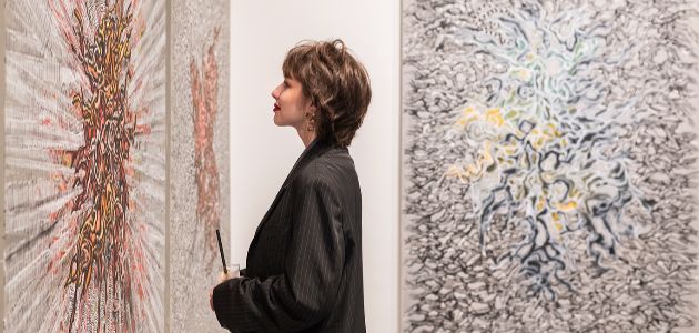 Na razmeđu slike i crteža stvara se prostor stalne mijene strukture radova i autorica upravo u toj zoni između dviju disciplina razvija svoj prepoznatljiv vizualni jezik – precizan i slojevit, istodobno racionalan i intuitivan. Crtež donosi jasnoću, strukturu i disciplinu geste, dok slika uvodi emocionalnu rafiniranost i atmosferu kao i osjećaj prostornosti. Ta napetost između kontroliranog i fluidnog tvori temelj umjetničkog istraživanja kojem je umjetnica posvećena više od deset godina. Motiv vrpce, trake ili linije koja se neprekidno nastavlja, pojavljuje se kao vizualna i misaona konstanta u njezinu radu. On nije samo formalni element, već i metafora toka misli, introspekcije i vremenskog preplitanja – sjećanja i iskustva, prolaznosti i kontinuiteta.
