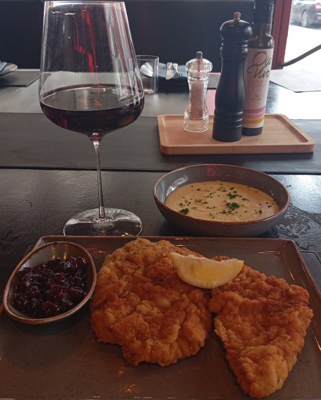 Za ručak, još jedan klasik – Wienerschnitzel baš kao u Beču – što je puni naziv popularnog šnicla, koji ničim ne zaostaje za originalom iz austrijske metropole. Mekana, tanko rezana teletina bez žilica, pohana u pročišćenom maslacu, zaista je pravi užitak uz koji još idu pire krumpir i umak od brusnica. Pinot noir 2022 iz vinarije Barun dodatno je upotpunio ove okuse.