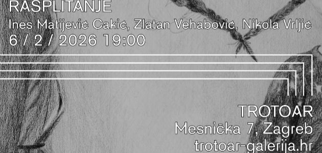 Otvorenje skupne izložbe ‘Rasplitanje’, na kojoj izlažu Ines Matijević Cakić, Zlatan Vehabović i Nikola Vrljić, održat će se u petak, 6. veljače u 19 sati u zagrebačkoj galeriji Trotoar. Kustosica izložbe je Martina Rodrigues.