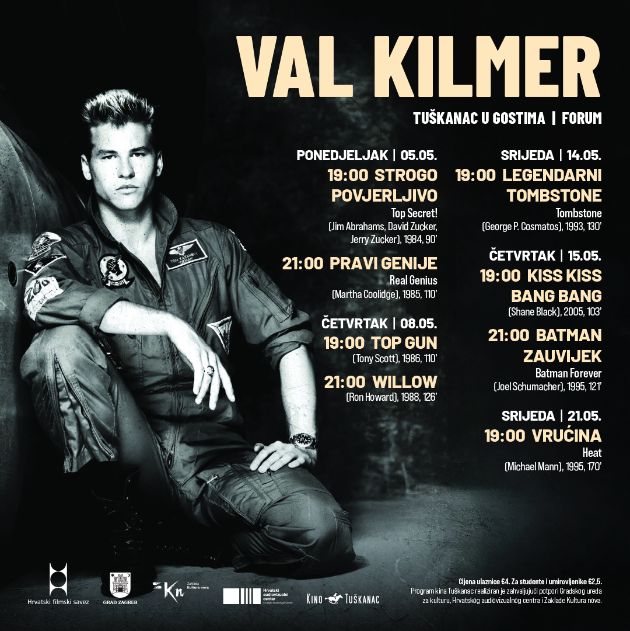 Ciklus donosi osam filmova koji će se prikazivati u zagrebačkom kinu Forum (Studentski dom Stjepan Radić). Ciklus će 5. svibnja (19 sati) otvoriti špijunska komedija ‘Strogo povjerljivo’ (1984.) u kojoj Kilmer debitira kao američki pjevač koji se u Berlinu nesvjesno upliće u istočnonjemačku zavjeru za ujedinjenje zemlje.