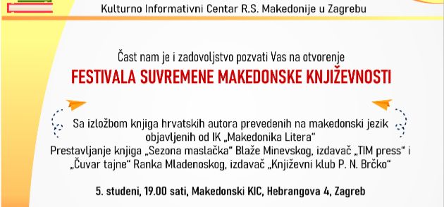 Makedonski kulturn-informativni centar u Zagrebu, u okviru svog godišnjeg programa, a u suradnji s renomiranom makedonskom izdavačkom kućom Makedonika Litera iz Skopja, ove godine osniva književni festival koji bi trebao doprinijeti afirmaciji i produbljivanju makedonsko-hrvatskih kulturnih veza, a posebno suradnji na području književnosti. Festival će otvoriti nove mogućnosti za kontinuirano (godišnje) predstavljanje suvremene makedonske književnosti, makedonske izdavačke djelatnosti, makedonskih pisaca, izdavačkih kuća, kao i makedonsko-hrvatskih odnosa i zastupljenosti hrvatskih autora na makedonskom i makedonskih autora na hrvatskom jeziku u izdavačkoj djelatnosti.