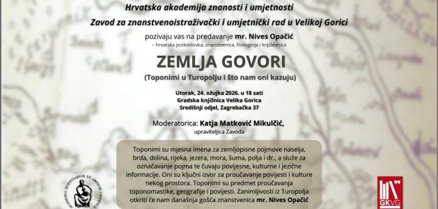 Predavanje pod nazivom ‘Zemlja govori’ (Toponimi u Turopolju i što nam oni kazuju) mr. Nives Opačić održat će se u utorak, 24. ožujka, u 18 sati u Središnjem odjelu Gradske knjižnice Velika Gorica (Zagrebačka 37).