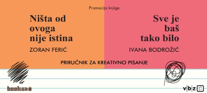 Promocija knjige ‘Ništa od ovoga nije istina’ Zorana Ferića i ‘Sve je baš tako bilo’ Ivane Bodrožić, jedinstvenog dvostrukog priručnika za kreativno pisanje nastalog na inicijativu književnog kluba Booksa, održat će se u petak, 21. studenoga (18 sati) u zagrebačkoj Booksi.